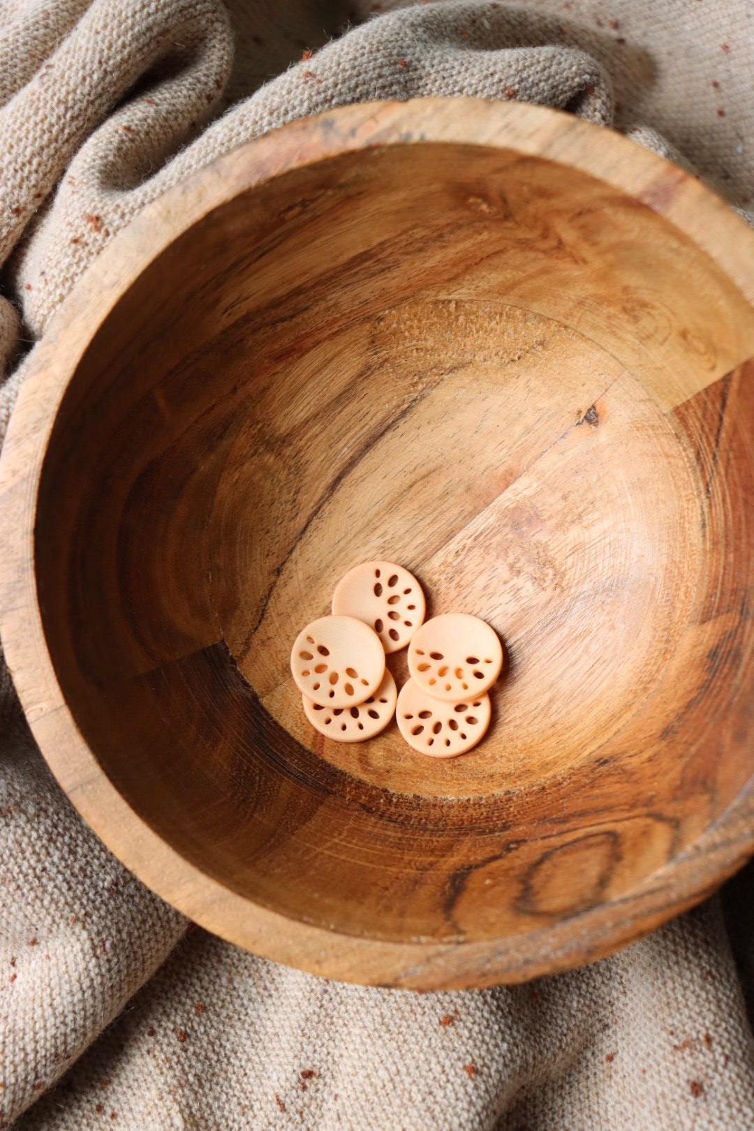 Bring a touch of artistry to your handmade garments with these round buttons, featuring a unique lotus-inspired cutout design. The delicately textured surface that catches the light beautifully, these buttons are available in a rich spectrum of colors—from earthy neutrals to vibrant jewel tones.