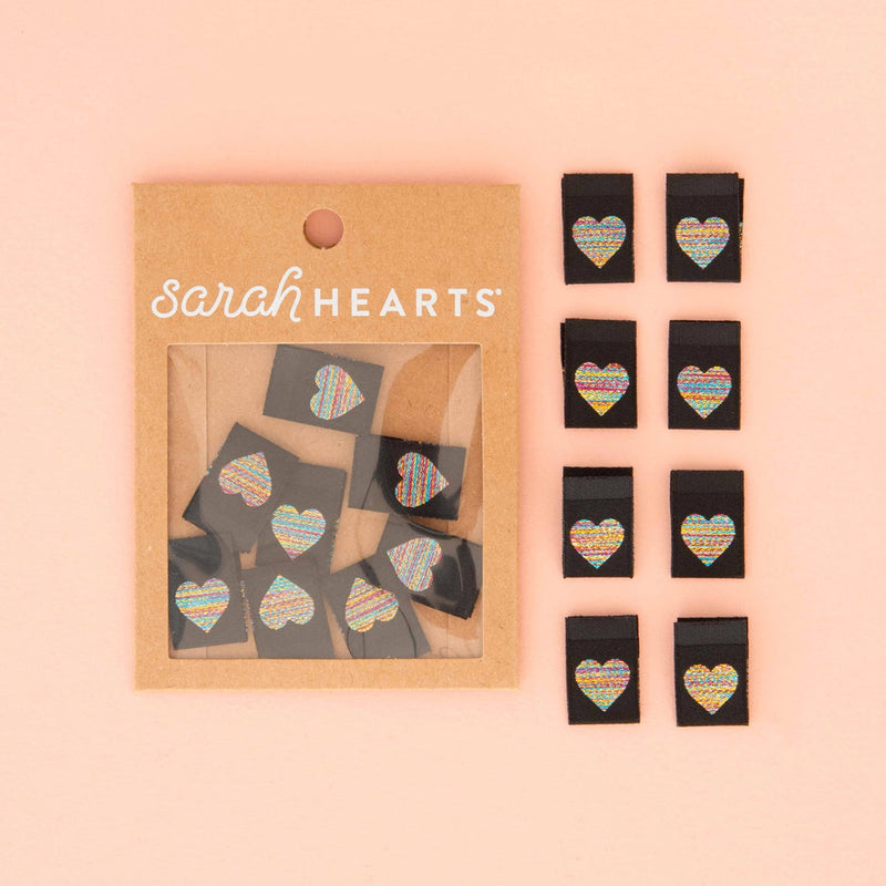 Add a bit of sparkle to your handmade items with our Metallic Rainbow Heart Woven Labels. Each label features colourful metallic thread with a black background that are sure to catch the eye. Perfect for sewing into garments, bags, or quilts.