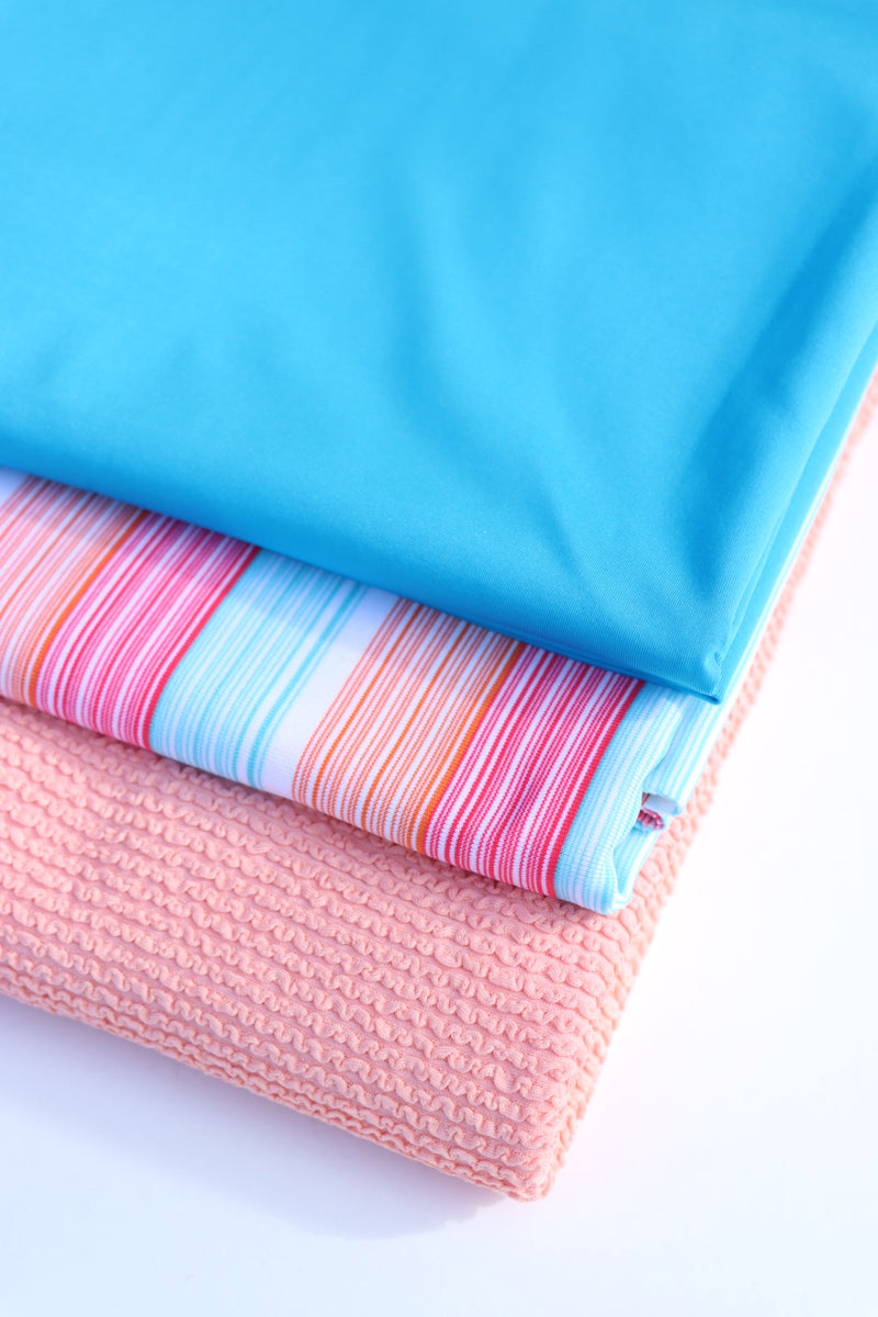 Each trio is intentionally paired to coordinate in color, print, and fabric hand, creating a cohesive bundle that’s ready for everything from streamlined activewear to mix-and-match swim sets. The selection is deliberate, giving you a beautifully balanced palette without the overwhelm of choosing individual cuts.